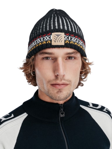 A rib-knit hat with a contrasting two-tone design and a double-knit construction. The detailed border around the fold-up hem is inspired by our greatest success ever: our original 1994 Lillehammer Olympic sweater.