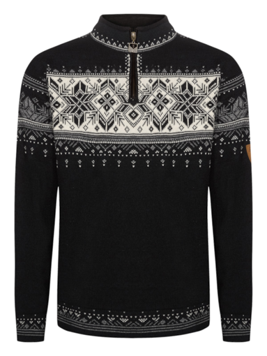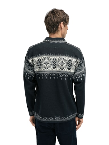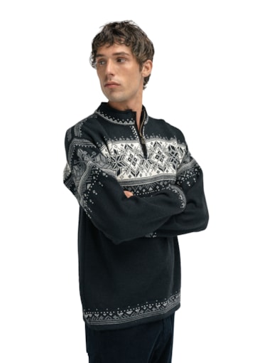 The Blyfjell is a best-selling men's sweater rooted in timeless Norwegian tradition. Made from 100% lightweight wool, it offers natural warmth and comfort while featuring a quarter-zip neckline with a fleece-lined collar for added softness. The intricate design showcases classic Norwegian folk patterns, including variations of the iconic eight-petal rose – a symbol of Norwegian heritage and artistry.