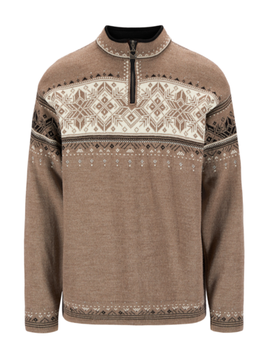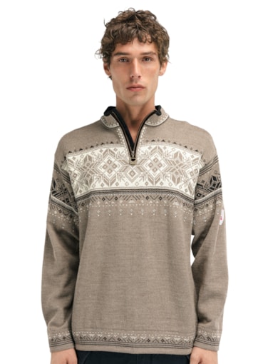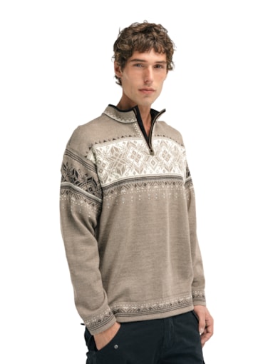 The Blyfjell is a best-selling men's sweater rooted in timeless Norwegian tradition. Made from 100% lightweight wool, it offers natural warmth and comfort while featuring a quarter-zip neckline with a fleece-lined collar for added softness. The intricate design showcases classic Norwegian folk patterns, including variations of the iconic eight-petal rose – a symbol of Norwegian heritage and artistry.