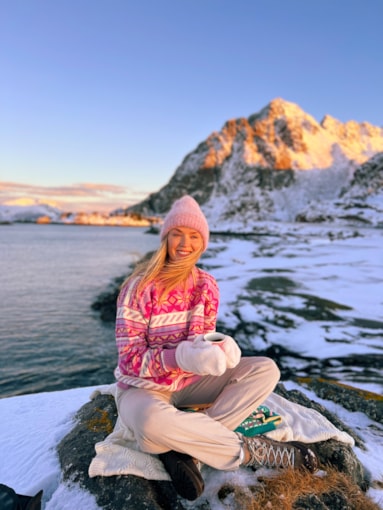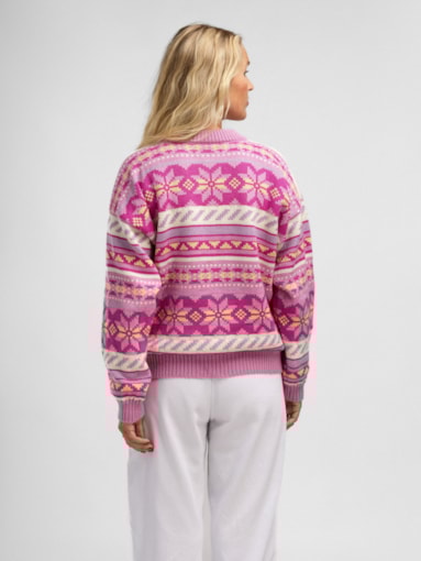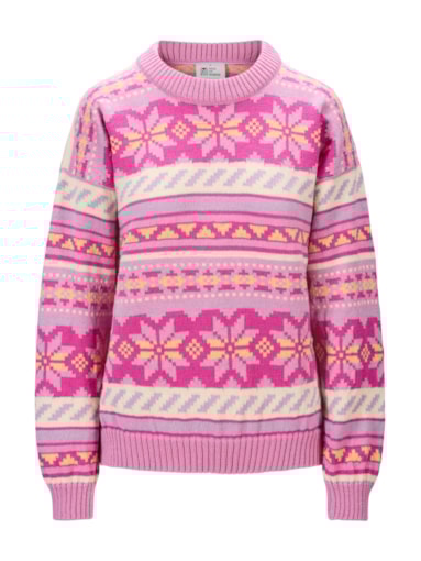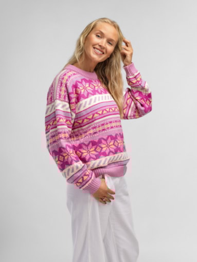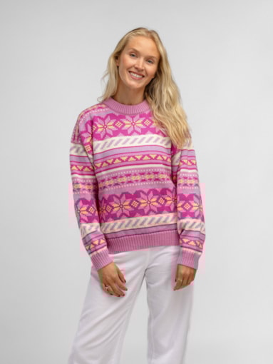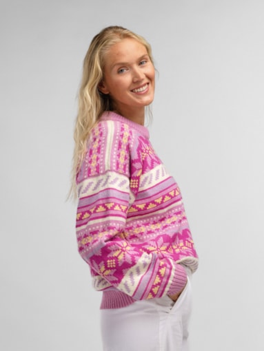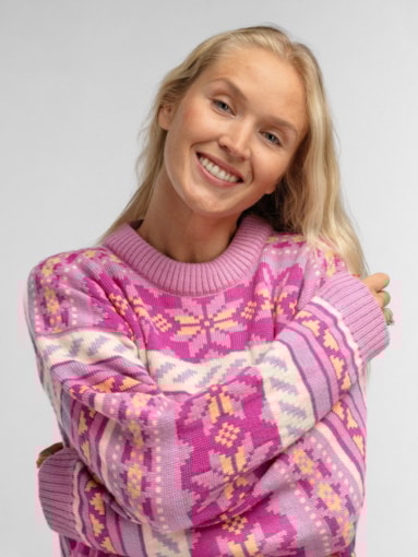 A new colorful Ingrid sweater. Inspired by classical designs from the 80s and 90s, the Ingrid sweater is a whimsical and fun patterned creation. Made with 100% long-lasting wool this sweater is co-developed with the outdoorsy Norwegian influencer Ingrid Raadim Hennig. Being an experienced Lofoten nomad, we have continued our collaboration to develop a new, light, and comfortable sweater reflecting the natural pastels found in these incredible surroundings. Ingrid is a huge vintage enthusiast, and you can find many iconic Dale of Norway sweaters in her closet. The design includes the distinctive eight-pedal rose and Dale of Norway’s pattern from our popular Bjorøy sweater. Merged with other elements from our archive’s we have created a new & playful design.