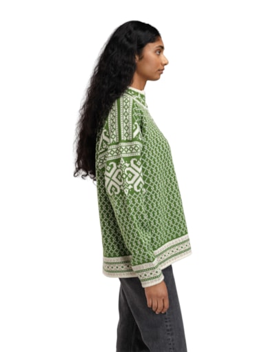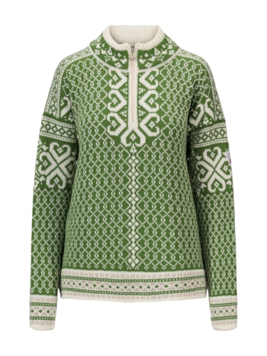 A heavy knitted, detailed, patterned wool sweater with a relaxed fit. The sweater has a semi-high neck with zipper and is knitted in 100% long-lasting wool. You can use Leknes both as a hiking sweater and for everyday wear. With a traditional Norwegian pattern and updated fit, this is a wool sweater that is both timeless and nostalgic.