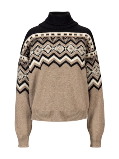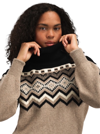 A super-soft merino sweater featuring a comfortable high neck and intricate pattern details in a mix of contrasting colors. The sweater is slightly cropped, with voluminous sleeves and a relaxed fit. It has chunky ribbed finishes at the cuffs, neckline, and bottom hem. Inspired by classic ski sweaters, the pattern is a reimagined version of our bestselling Vilja sweater.