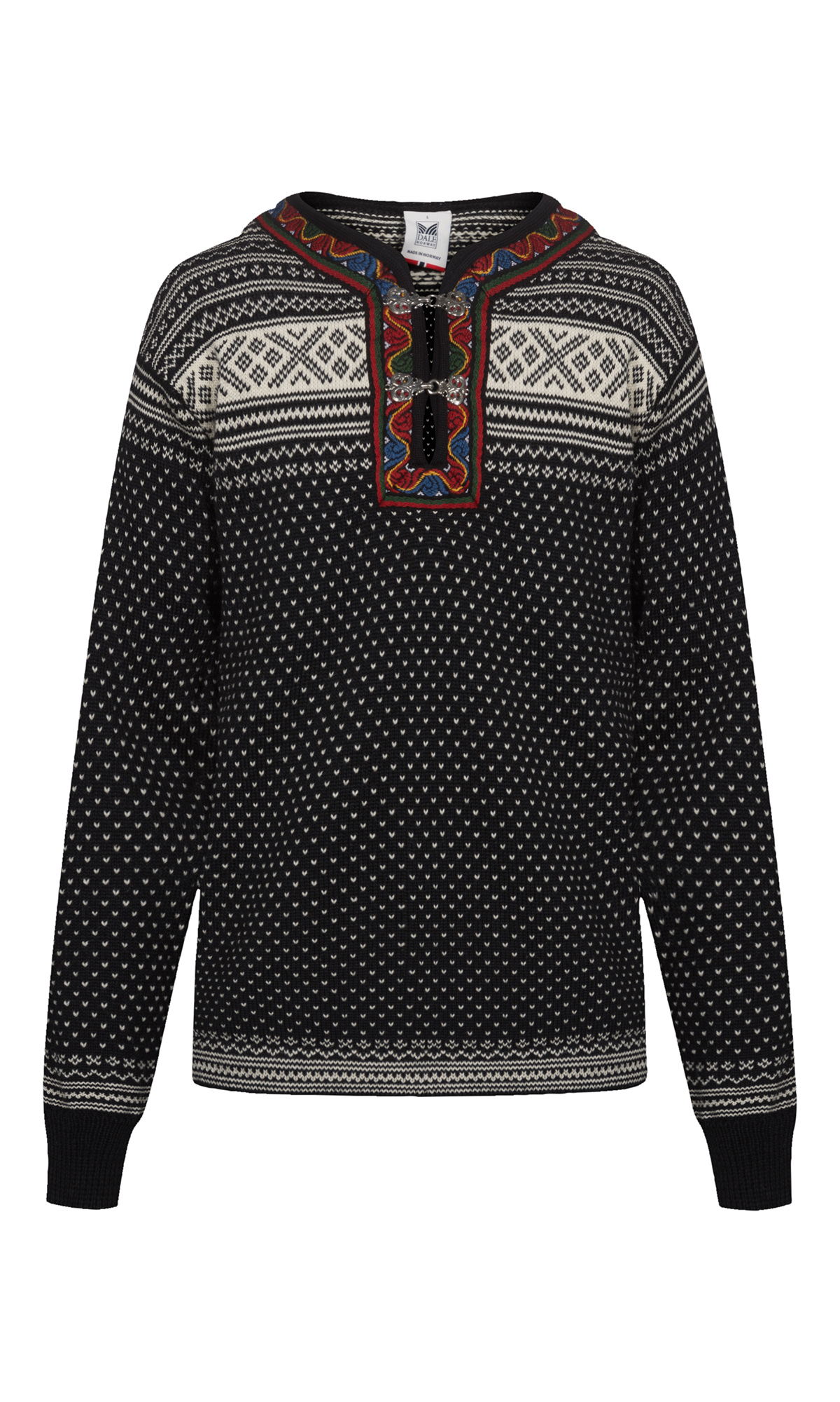 The Setesdal design is Norway’s most famous pattern. This is the original "lusekofte," knitted in 100% Norwegian wool, with Norwegian-made pewter clasps and woven bands, identical to the original design. The wool sweater features the well-known "luse" pattern and traditional crosses, which were originally knitted in to protect against evil spirits.