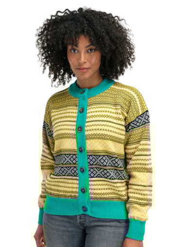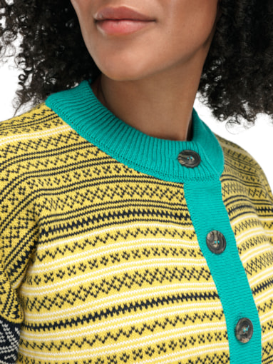 • A fresh reinterpretation of the classic Setesdal jacket. The cardigan’s design plays with the Setesdal pattern and is offset by contrast-colored sleeves, bottom hem and button placket. The wool cardigan has a center front button closure, dropped shoulders creating a relaxed fit. Skarpøy is knitted in 100% long-lasting wool and has buttons made from 50% recycled paper.