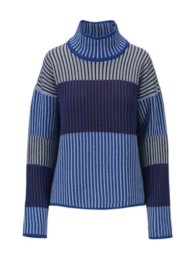 • A playful sweater with a relaxed, dropped shoulder giving a wide fit. The sweater is knitted in a tonal palette and a structured effect giving a rib look-a-like. Despite the split look, the front, back and sleeves of the sweater are knitted as whole pieces. The high neck is single knitted with a wide shape for comfort and room.