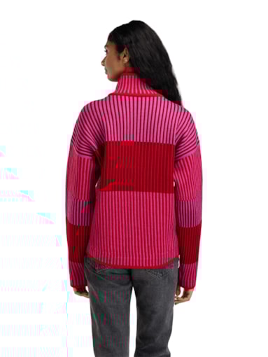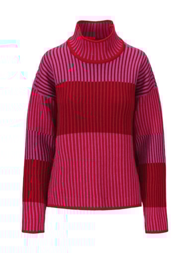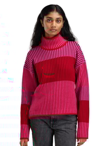 • A playful sweater with a relaxed, dropped shoulder giving a wide fit. The sweater is knitted in a tonal palette and a structured effect giving a rib look-a-like. Despite the split look, the front, back and sleeves of the sweater are knitted as whole pieces. The high neck is single knitted with a wide shape for comfort and room.