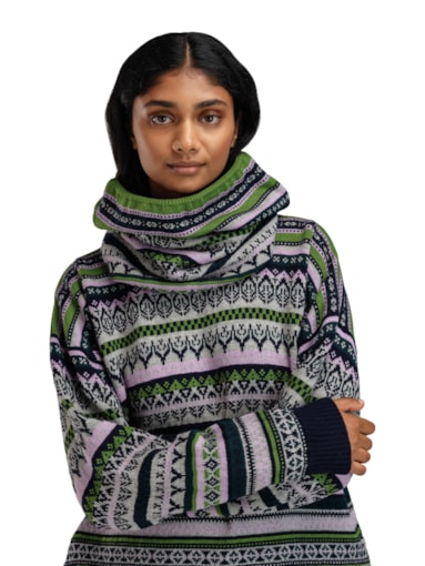 A playful, detailed and fully patterned tubular scarf with rib knit edging. Utsira is knitted in 100% long-lasting wool. The pattern is a mix of historical Dale patterns.