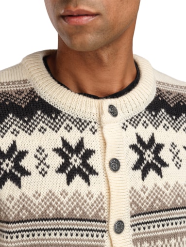 A classic, retro wool jacket with detailed patterns reminiscing back to the 1950s and 60s. The jacket has a front button closure with Norwegian-made pewter buttons. The Veafjord is knitted in 100% long-lasting Norwegian wool, making the wool jacket extra warm and durable.